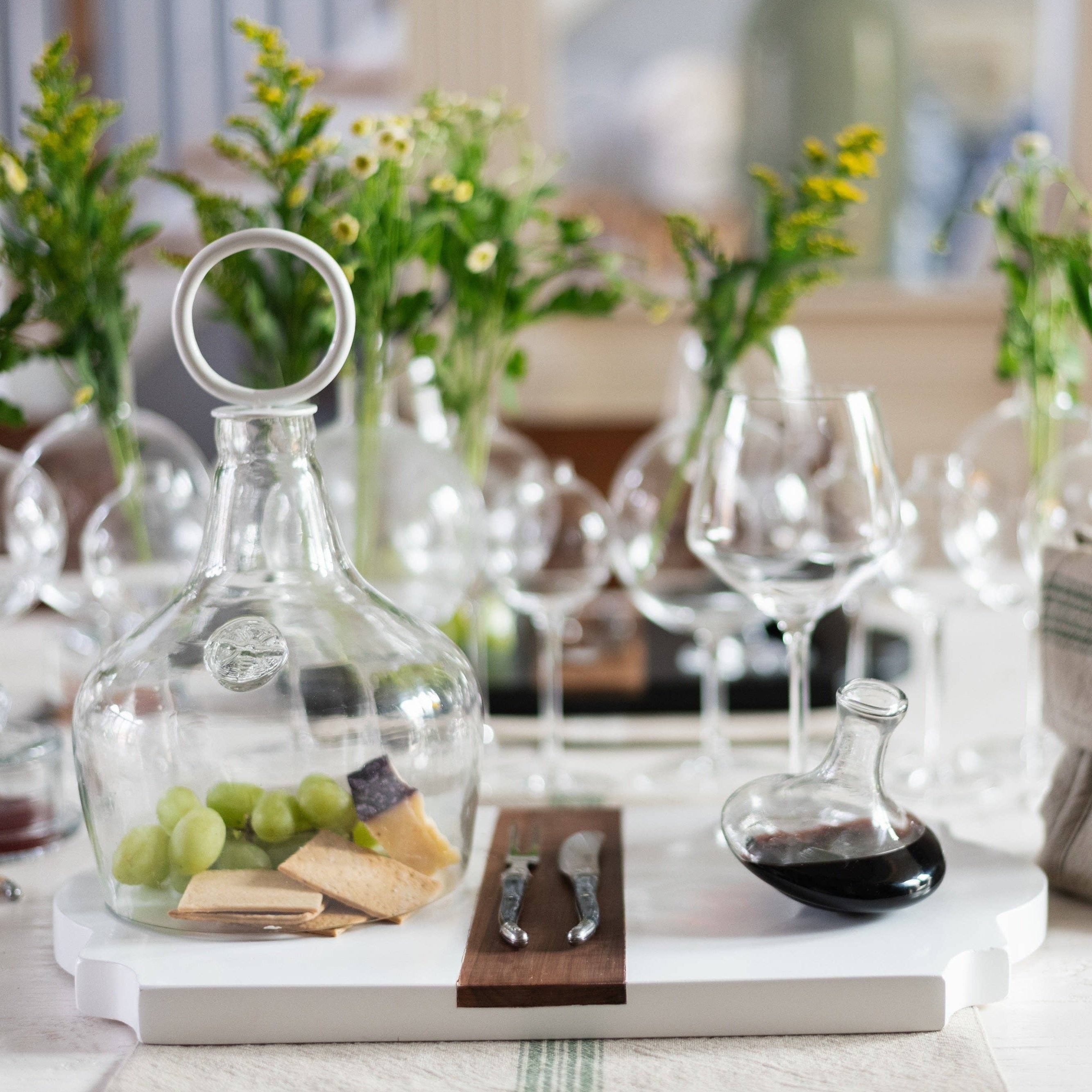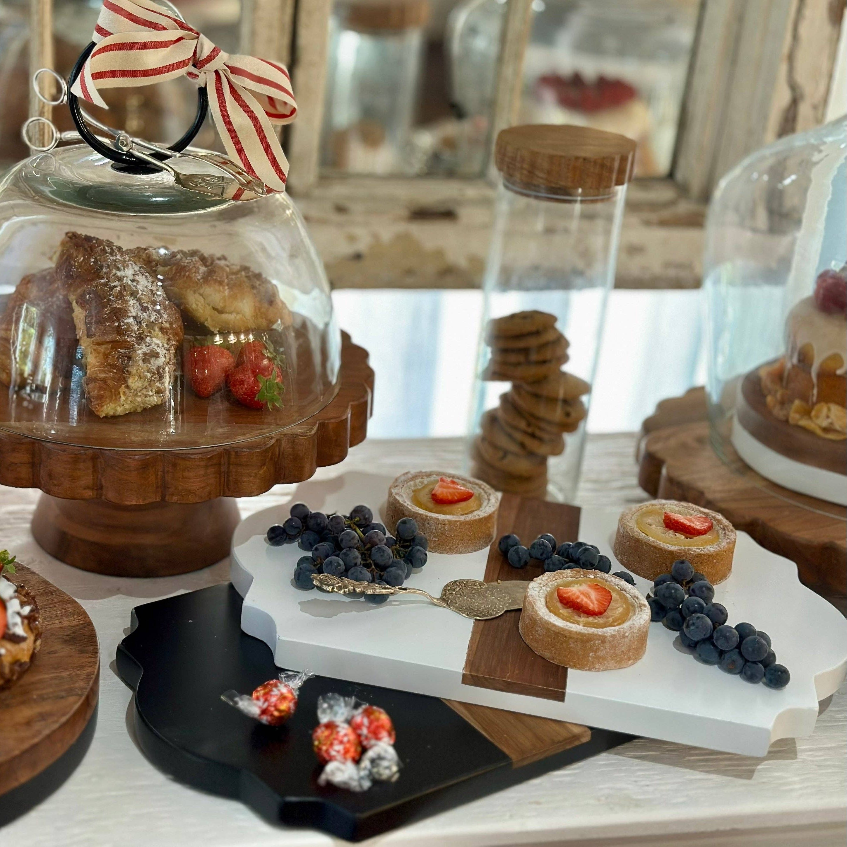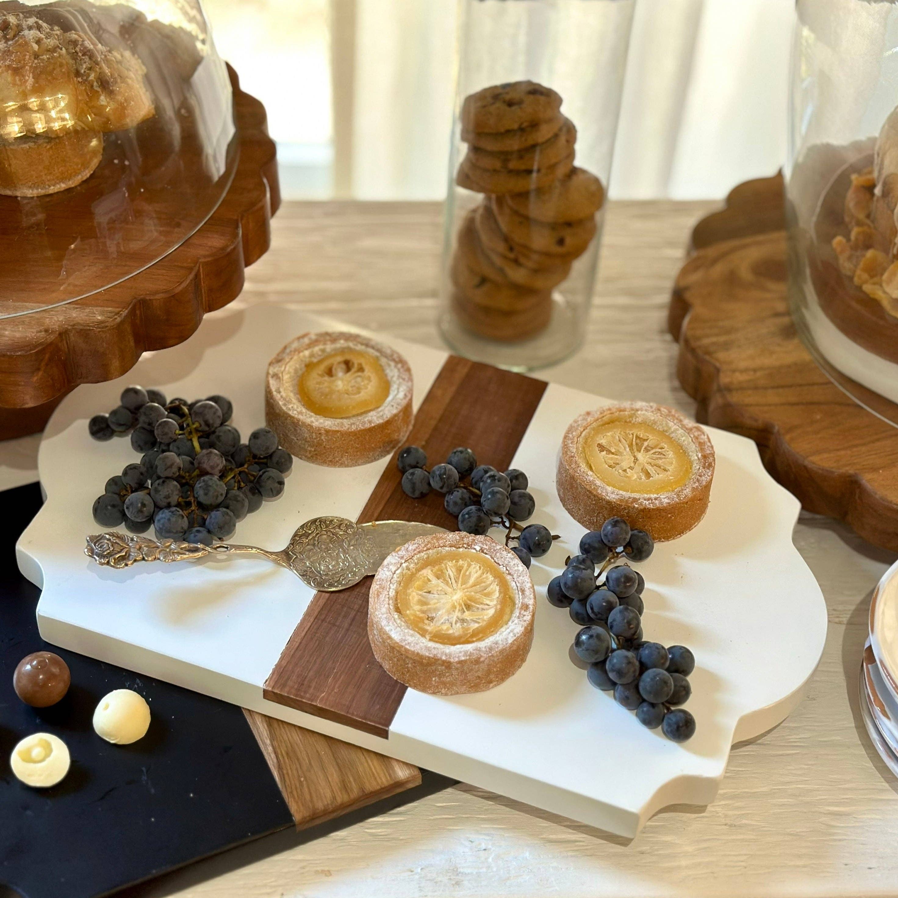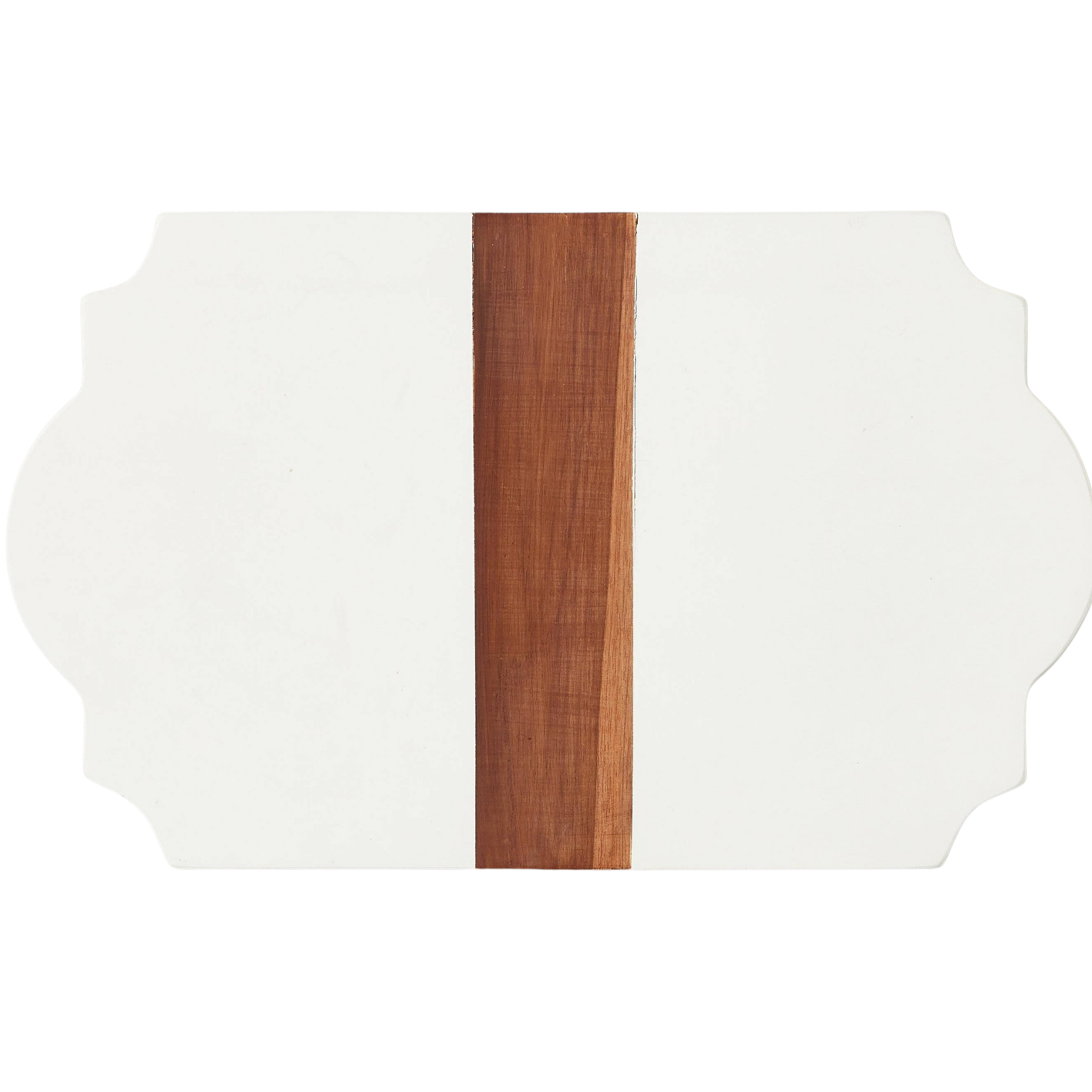 The Trefoil Wood Cheese Board Charger brings sculptural beauty and modern charm to any table setting. Crafted from mango wood, it features a distinctive trefoil-shaped edge and a thick natural wood slat through the center—balancing form and texture with effortless sophistication. Perfect for layering beneath serveware or displaying cheeses and small bites, this board is designed to elevate every gathering with its refined, versatile style. This piece is intended for serving only and is not suitable for cutting. To preserve the integrity of the finish, always use a barrier—such as parchment, a plate, or a bowl—when presenting highly pigmented or acidic foods.