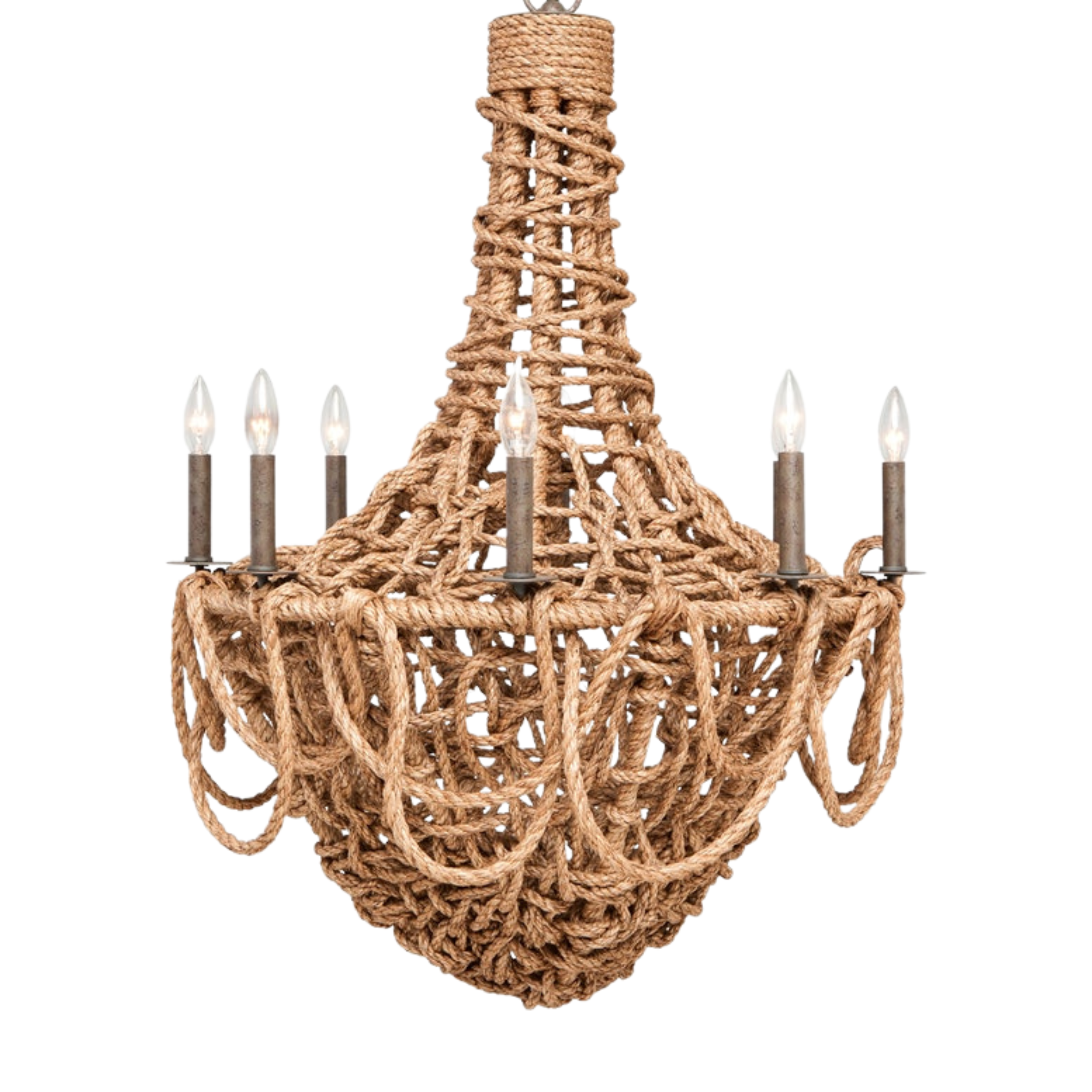 Woven abaca is hand knotted tightly toward the bottom and artfully draped toward the top to create the silhouette of the Larson, a chandelier as organic as its shape is opulent. Utilitarian material combined with an easy elegance makes the Larson a striking addition to a variety of environments.