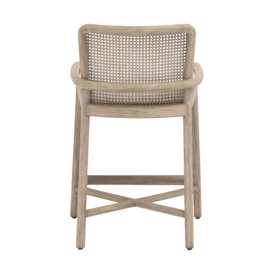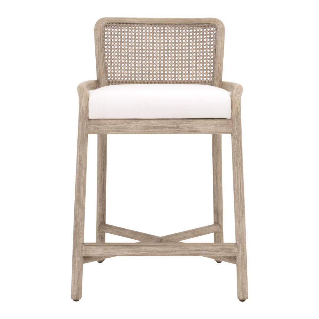 Elevate your kitchen island or breakfast bar with the Avalon Counter Stool — a thoughtful fusion of classic craftsmanship and modern functionality. The frame is hand-crafted in solid mahogany with a refined Natural Gray finish, while the woven cane back introduces texture and timeless appeal. A fixed seat cushion upholstered in premium LiveSmart® Peyton-Pearl performance fabric ensures durability, easy cleaning, and everyday comfort.