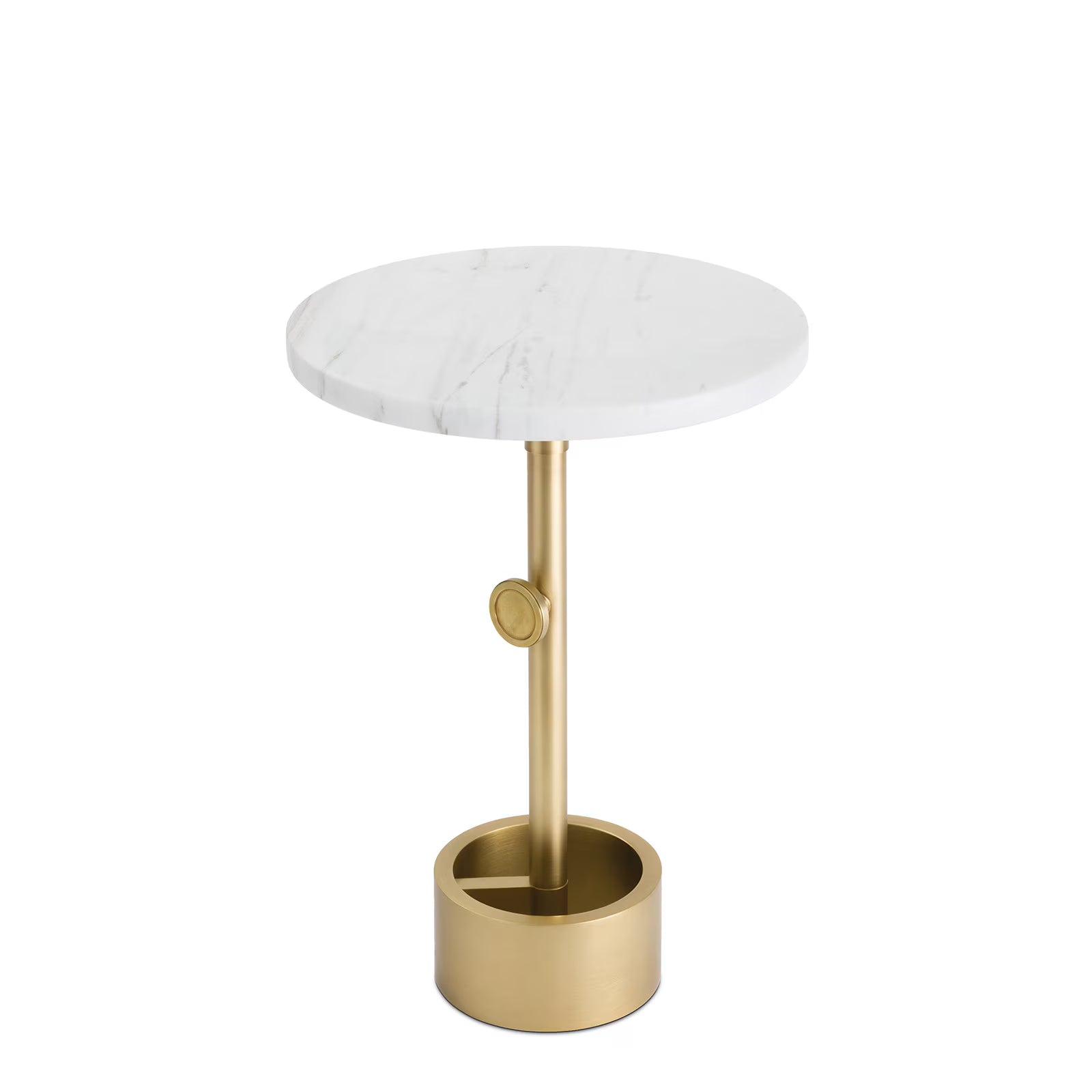 The Myles Accent Table fuses chunky, hardware-inspired elements with sleek modern marble. The table’s adjustable-height base plays on industrial style, while its marble top ties in classic elegance.