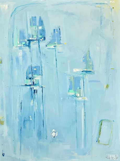 Boat Wake – The Regatta by Carol Hunter captures the fluid energy of sailboats in motion, interpreted through dreamy layers of seafoam blues and soft abstract forms. The textured strokes and luminous palette evoke the quiet rhythm of water, wind, and coastal life—making it a perfect statement piece for serene, seaside-inspired spaces. This original painting brings calm movement and coastal sophistication to any room.