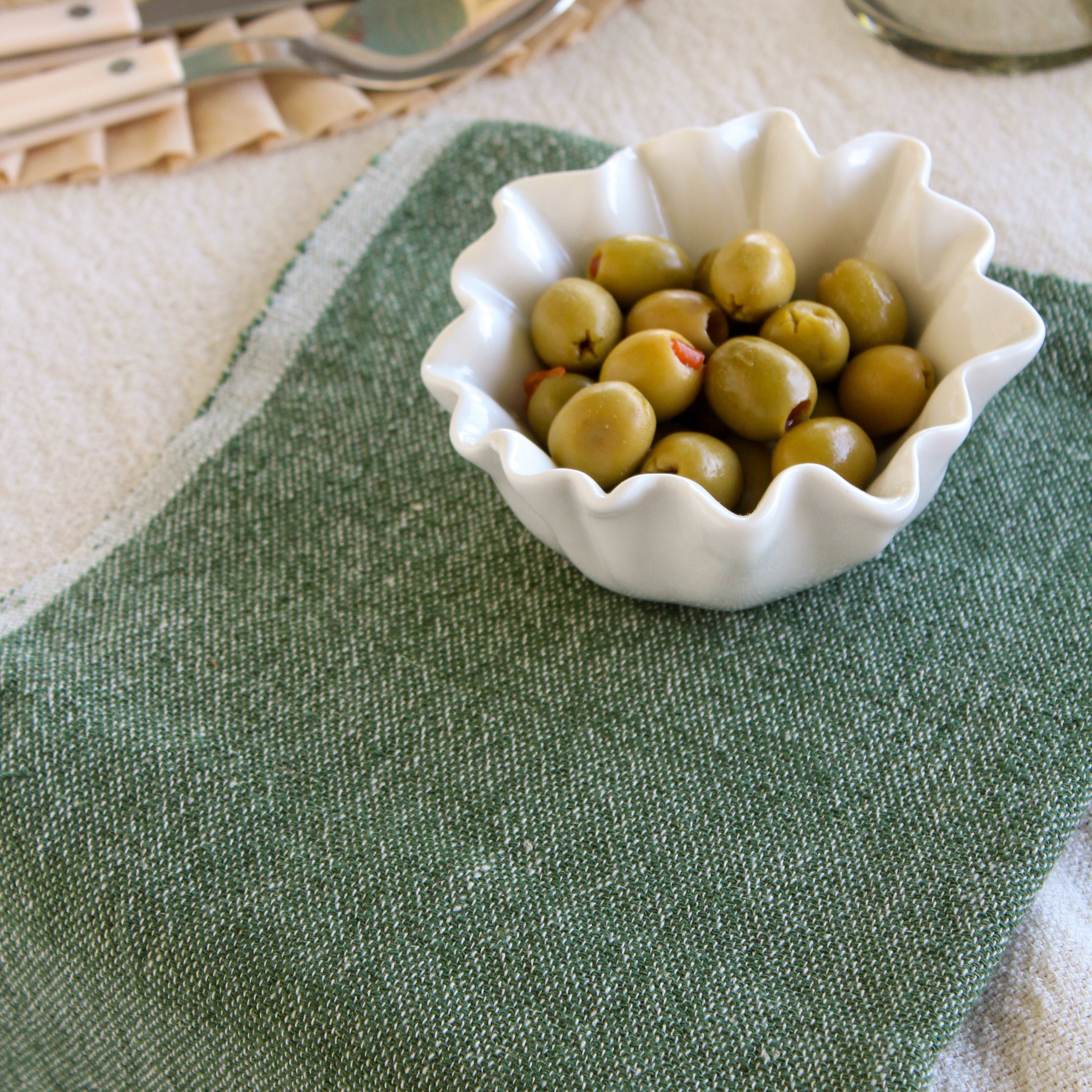 This best-selling, 14” x 28” olive hand towel is 100% organic cotton & can find many uses around the home. The texture, handmade quality, and simple solid color with a thin natural border along the edge set this hand towel apart. Spun, dyed (AZO free), & created by artisan partners.