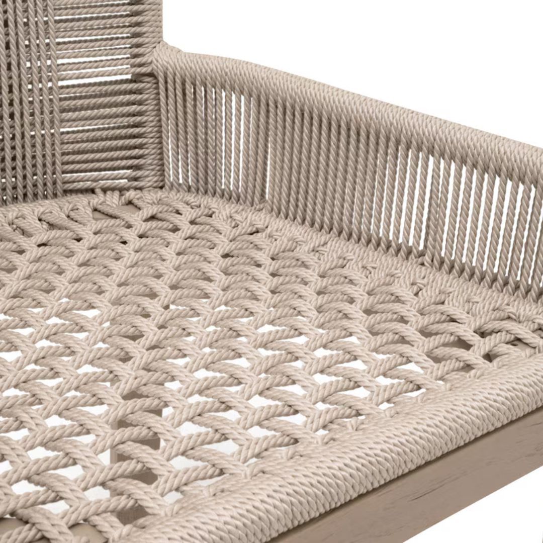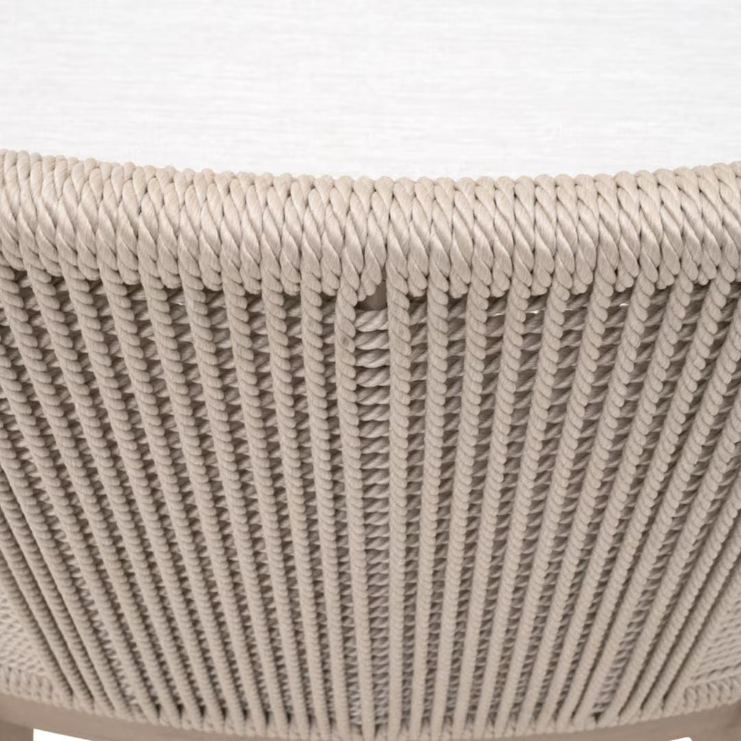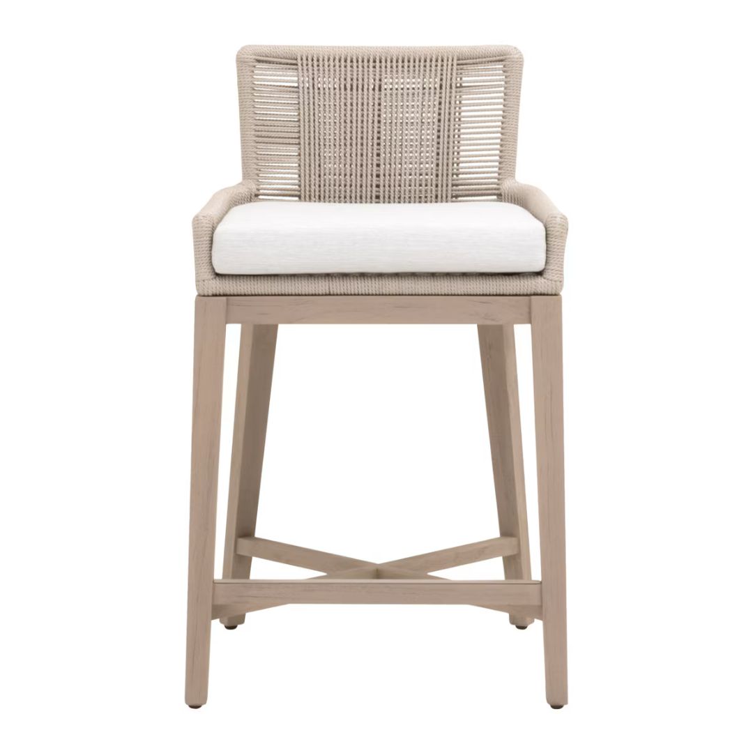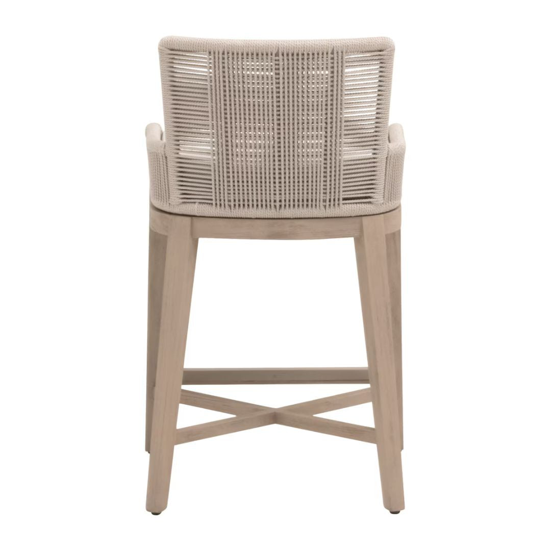 Refined coastal texture meets outdoor-ready durability in this elevated counter-height seating piece. The Overlay Outdoor Counter Stool features a solid teak wood frame in a “Washed Ever Teak” finish, paired with an oyster-twist hand-woven polyolefin rope back and a removable weather-resistant performance cushion in white-speckle olefin fabric.